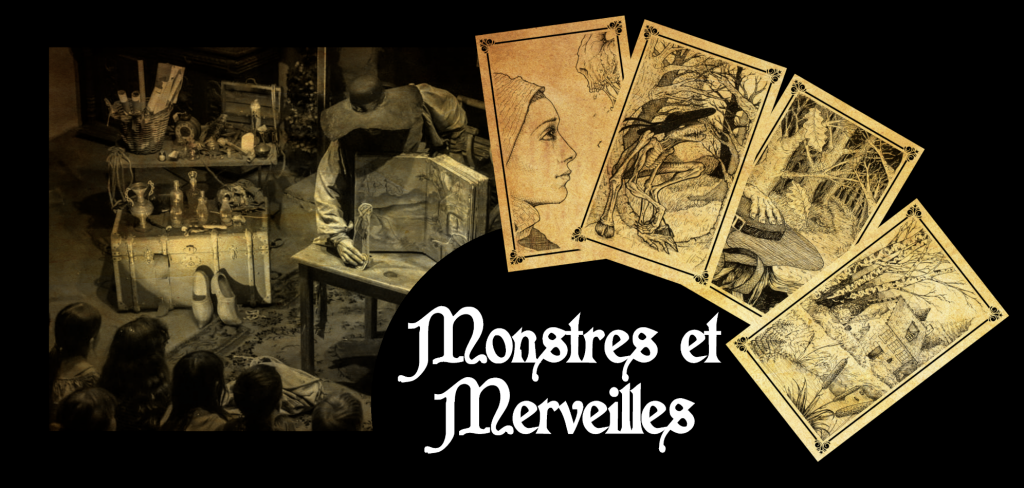 Monstres et Merveilles est le fruit d’une quinzaine d’années d’exploration des contes et légendes de Bretagne à travers des lectures, des rencontres et des témoignages. Il s’agit d’offrir à ces histoires une matérialité, de les rendre palpables pour le public, par la présentation d’un véritable « cabinet de curiosités », rempli d’objets et d’illustrations. L’ambition est de guider le spectateur dans un univers immersif en donnant de l’épaisseur et de la « vérité » aux légendes. Nous proposons en supplément du spectacle une exposition des illustrations réalisées pour le spectacle et du cabinet de curiosité à destinations des salles, des établissements scolaires ou des médiathèques.